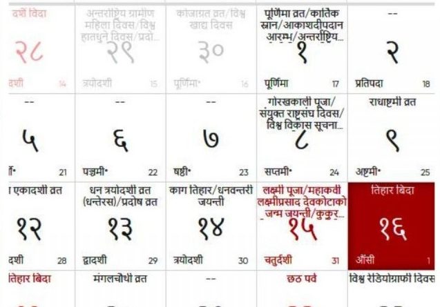 मुलुकमा नेपालीको दोस्रो ठूलो चाड यमपञ्चक अर्थात् तिहारको औँसीको दिन भए पनि आज कुनै तिहारको पर्व भने नपरेको नेपाल पञ्चाङ्ग निर्णायक विकास समितिले जनाएको छ । यो वर्ष तिथिको घटबढका कारण औँसीमा सूर्योदय भएको आजको दिन कुनै पर्व नपरेको समितिका अध्यक्ष प्रा श्रीकृष्ण अधिकारीले जानकारी दिए । तिथिका आधारमा यस्तो संरचना केही वर्षका अन्तरालमा हुने गरेको उनले सुनाए । औँसी बेलुकी भएका दिन गरिने लक्ष्मीपूजा बिहीबार नै गरिएको छ । औँसीसहित कार्तिक शुक्ल प्रतिपदा भएका दिन गरिने गाई पूजा भोलि शनिबार परेको पनि समितिले तिहारका सम्बन्धमा जारी गरेको विज्ञप्तिमा उल्लेख छ । आज तिहारको कुनै पर्व नपरे पनि औँसी आफैँमा पर्व हो । प्रत्येक महिनाको औँसीलाई पर्व मानिन्छ । औँसीमा विशेषगरी पितृकर्म हुने गर्छ । यस्तो संरचना परेकैले पाँच दिनमा सकिने दोस्रो चाड तिहार यस वर्ष छ दिनसम्म लम्बिएको छ । कार्तिक कृष्ण त्रयोदशीका दिन सुरु हुने तिहार यस वर्ष कात्तिक १३ गते मङ्गलबार सुरु भएको थियो । नेपालका कतिपय भाग र केही समुदायमा कार्तिक कृष्ण औँसीकै दिनमा गाई पूजा गर्ने परम्परा रहे पनि औँसीको अन्त्य र प्रतिपदाको सुरुमा गाई पूजा गर्नुपर्ने शास्त्रीय मान्यता रहेको धर्मशास्त्रविद् प्रा डा रामचन्द्र गौतमले जानकारी दिए । यो पर्व कार्तिक शुक्ल द्वितीयाका दिन कात्तिक १८ गते आइतबार दिदीबहिनीका हातबाट दाजुभाइ विधिपूर्वक परम्पराअनुसार पञ्चरङ्गी वा सप्तरङ्गी टीका लगाएपछि सकिन्छ । गाईलाई गौमाताका रूपमा सम्मान गरिने भएकाले वर्षका तीन सय ६५ दिन नै गाई पूजा गर्न पनि सकिन्छ । तर तिहारका अवसरमा गरिने गाई पूजा भने भोलि शनिबार नै गर्नुपर्ने उनको भनाइ छ । यसैले गाईतिहार पनि शनिबार नै मनाइन्छ । यसरी प्रष्ट पार्दापार्दै पनि आजै गाई पूजा भनी चर्चा परिचर्चा भइरहेकाले यसप्रति सचेत हुन समितिले आह्वान गरेको छ । कात्तिक १७ गते शनिबार भने गाईगोरु पूजा, गोवद्र्धनपूजा, बलिपूजा, हलीतिहार, म्ह (आत्म) पूजा र नेपाल संवत् ११४५ प्रारम्भ पनि गरी छवटा पर्व एकै दिन परेको समितिले स्वीकृति दिएका पात्रो (पञ्चाङ्ग) र भित्तेपात्रोमा उल्लेख गरिनुका साथै समितिले तिहारको अवसरमा जारी गरेको विज्ञप्तिमा पनि प्रष्ट रूपमा लेखिएको छ ।